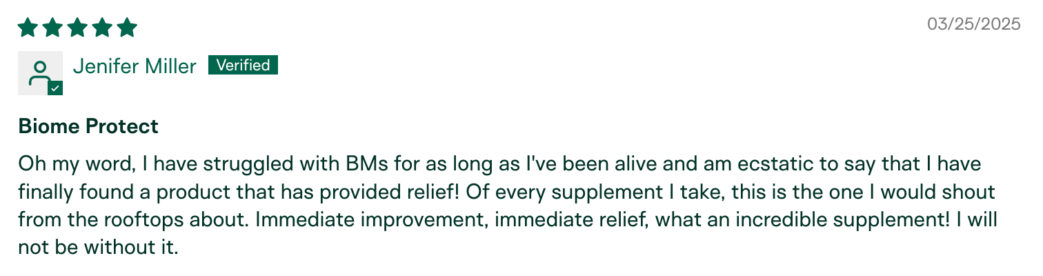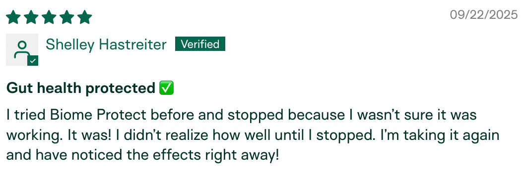 About 4 or 5 years ago, I started noticing that my digestion was sluggish. I increased my fiber intake, exercised, limited junk and ate a ton of fruits, vegetables and whole grains. The better I ate, the worse it got until I began noticing heart burn, gas and bloating after every meal. Nevermind the chronic constipation. After my doctors only offered bandaids to relieve the symptoms, I realized I was on my own. I've tried everything to relieve the discomfort. Most things would work, but only for a few weeks and then the miserable symptoms would return. It's been about a month and a half since I started taking BiomeProtect and I've been able to lower my omeprazole dose and the bloating, gas and constipation are much better. I'm far from being "my old self" but for the first time in years, I'm not in constant discomfort. I do take a separate probiotic a few times a week that seems to also give me an extra boost when I need it. So far, so good! My fingers are crossed it continues to work its magic.