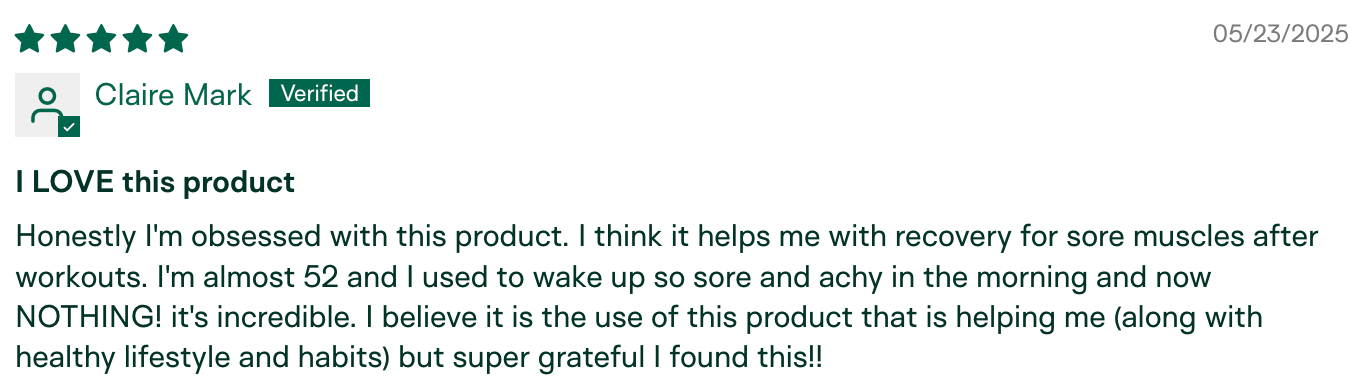 "I'm almost 52 and I used to wake up so sore and achy in the morning and now NOTHING! It's incredible." – Claire Mark, Verified Customer