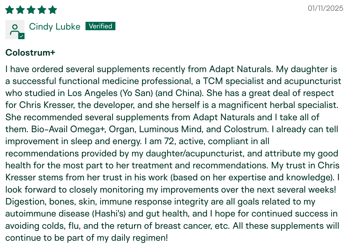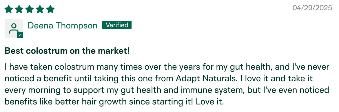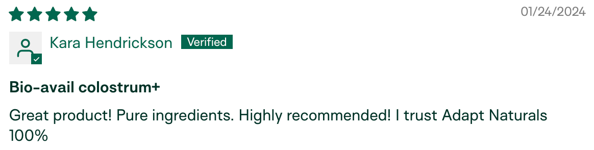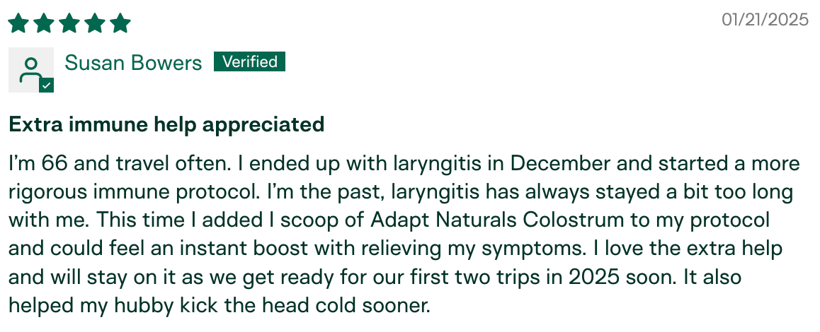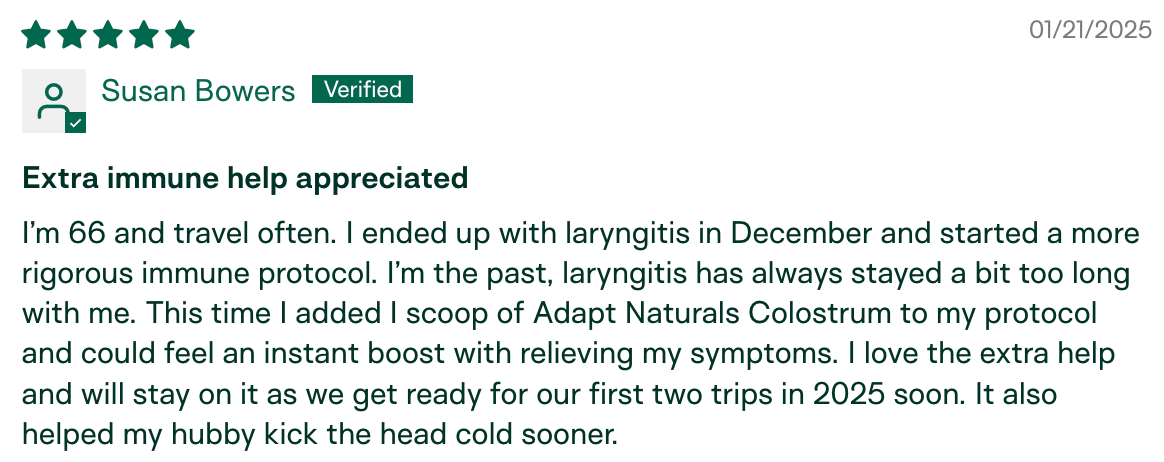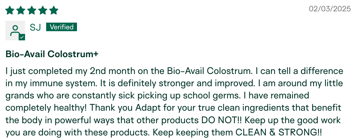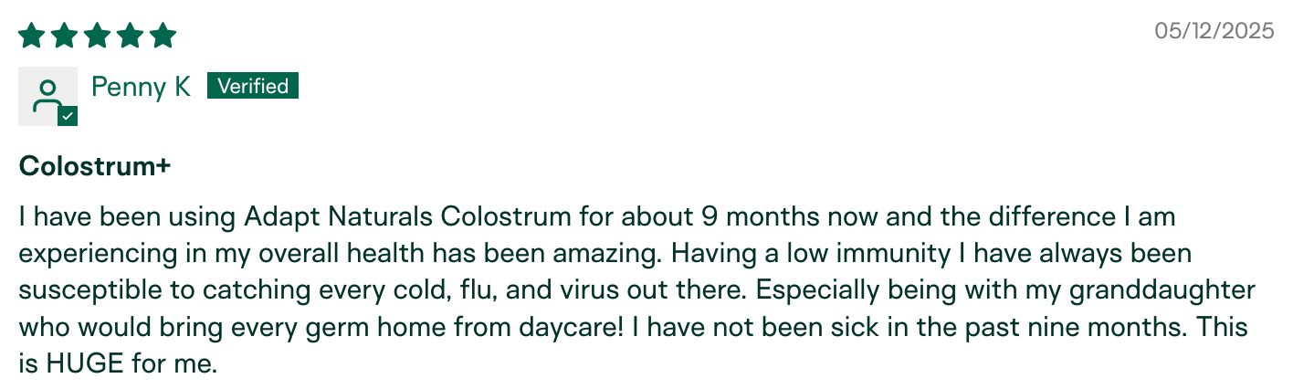 "I have been using Adapt Naturals Colostrum for about 9 months now and the difference I am experiencing in my overall health has been amazing. Having a low immunity I have always been susceptible to catching every cold, flu, and virus out there. Especially being with my granddaughter who would bring every germ home from daycare! I have not been sick in the past nine months. This is HUGE for me." – Penny K., verified buyer