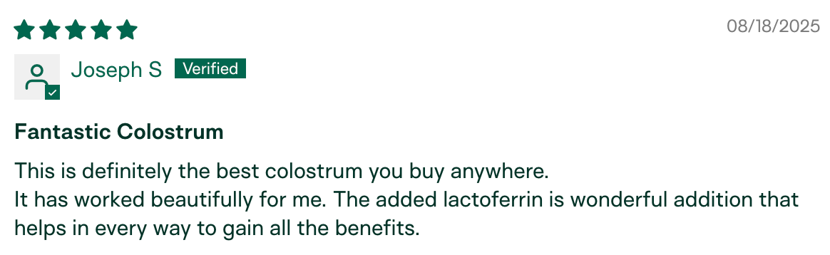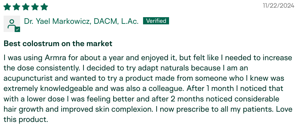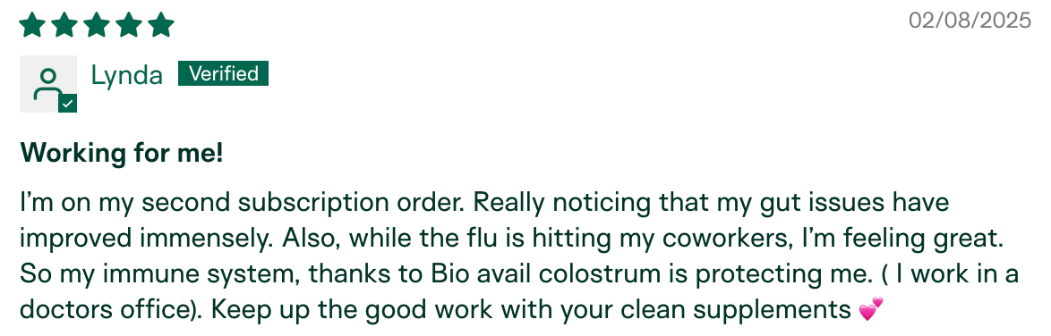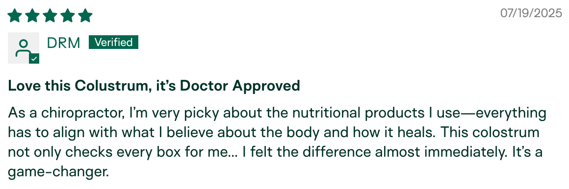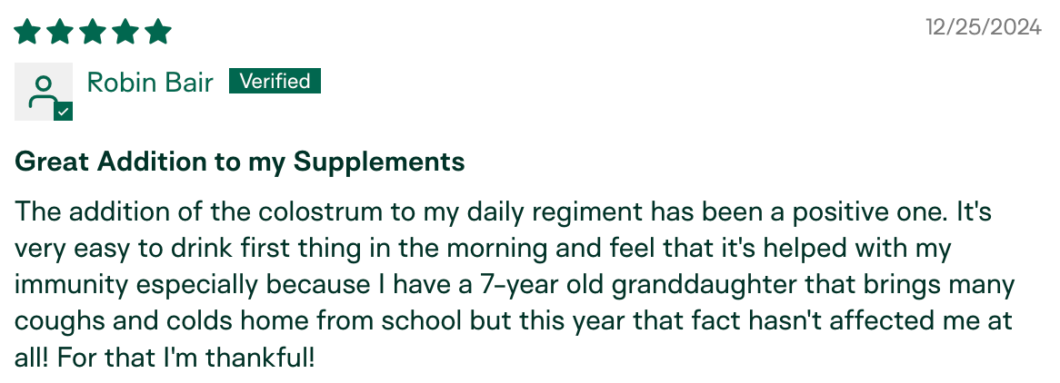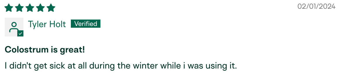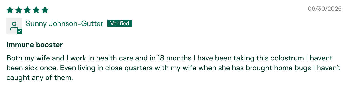 "I am the only one in my circle who hasn't gotten sick this season. My husband has been sick for the last month and a half, we went to a child's party with 10+ kids, and I've been around other sick individuals in public. I have not gotten sick! I relate it to the colostrum." – Meg K., verified buyer