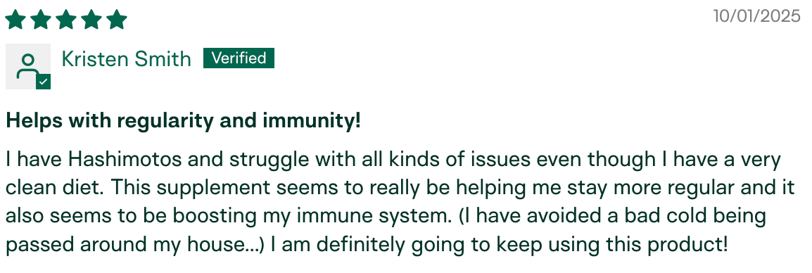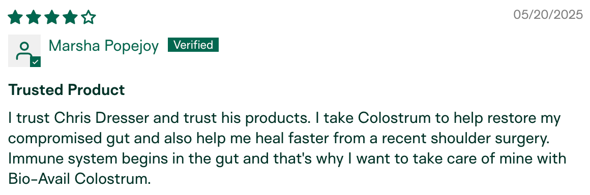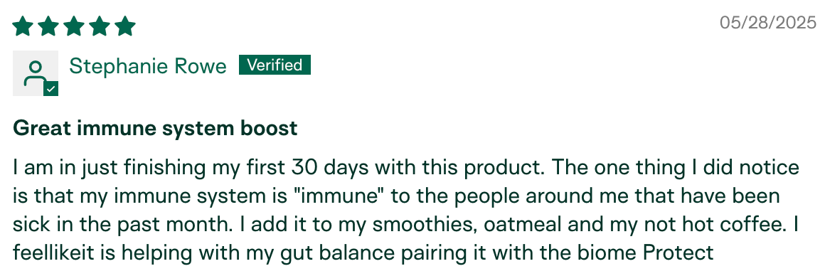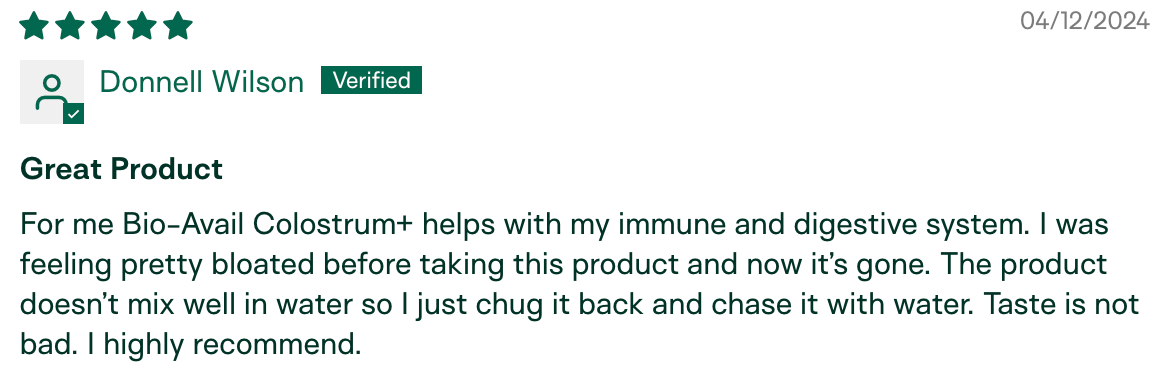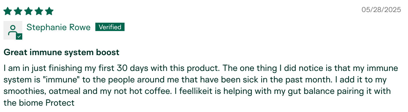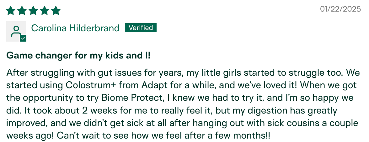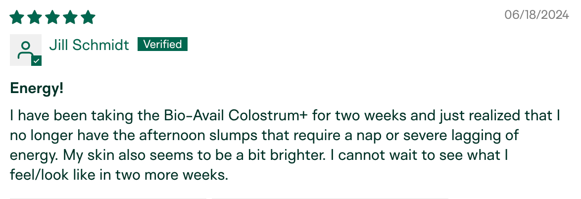 "I am the only one in my circle who hasn't gotten sick this season. My husband has been sick for the last month and a half, we went to a child's party with 10+ kids, and I've been around other sick individuals in public. I have not gotten sick! I relate it to the colostrum." – Meg K., verified buyer