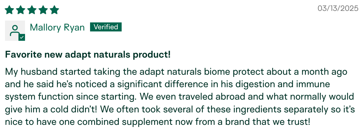 "There are so many probiotics out there, but how do you know what is really inside of them? I am so glad that Adapt Naturals created Biome Protect—I trust this company because of their 3rd party testing and the fact that they openly share their Certificates of Analysis (COAs) on their website." –Kim DelMonico, verified buyer