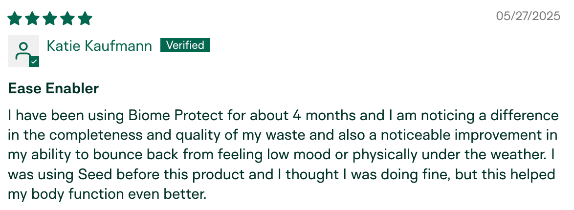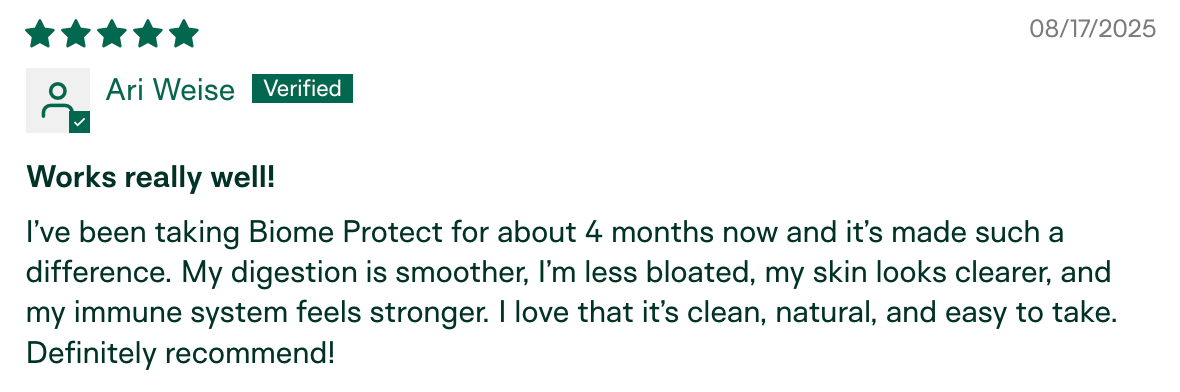 "After 4 rounds of seemingly necessary antibiotics (surgeries, infections), my husband started experiencing obvious gut issues... Figured that was our best shot at a quality product. My husband has been on Biome Protect about 5 weeks now and his gut issues have turned around." – C.U., verified buyer
