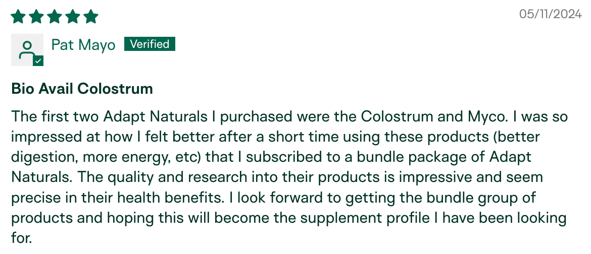"My husband and I both take a daily dose and feel it has kept us healthy even with exposure to sick grandkids a few times. I know it has given me some relief from painful joints brought on by cancer treatments. My husband has a debilitating autoimmunity (LEMS) and using Adapt colostrum helps with his inflammation and energy levels." – Larry Teal, verified buyer