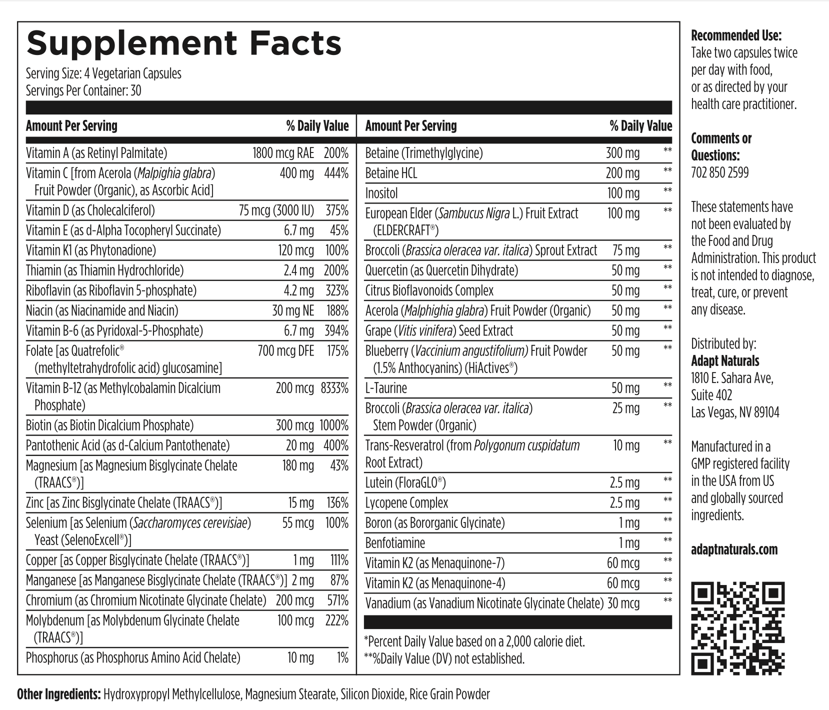 We’ve increased the dose of vitamin A to 2,000 mcg RAE, and 100% of that is in the active form (retinyl palmitate). Many people don’t get enough of this crucial nutrient, but most multis contain beta-carotene, a precursor form of vitamin A that is not always converted into the active form (retinol).