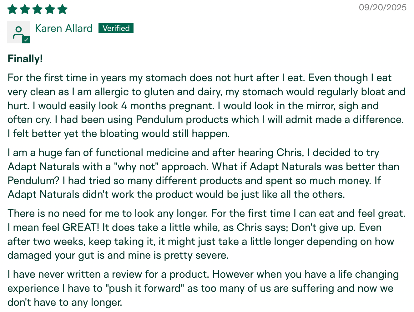 "I've been using Adapt Naturals colostrum for three months and the difference in my digestion, bloating, and skin appearance is substantial." –Hope, Verified Buyer