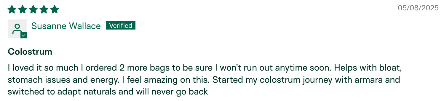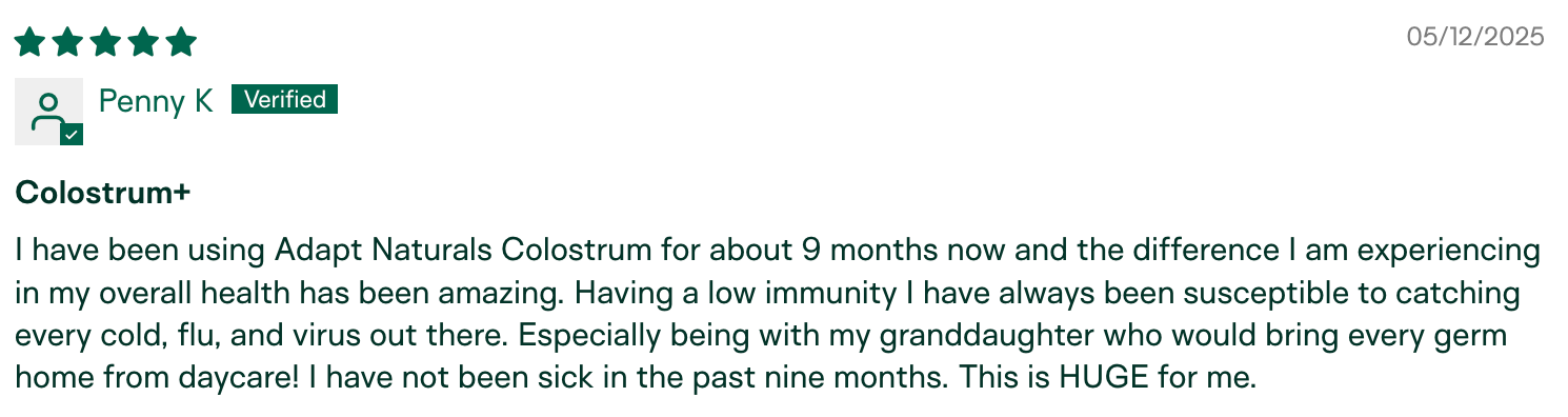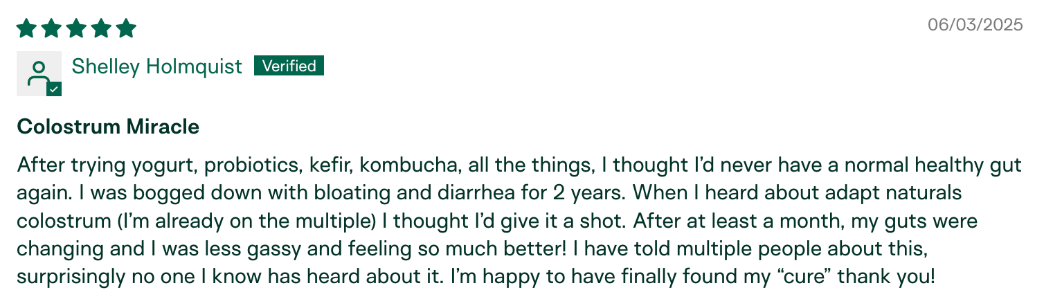 "Adapt Naturals Bio-Avail Colostrum has been a game changer for my health. Within days, I noticed better digestion, improved energy, and a stronger immune system. The quality is top-notch, and it mixes easily with no strange aftertaste. I feel healthier and more resilient than ever – highly recommend!" –Kristen, Verified Buyer